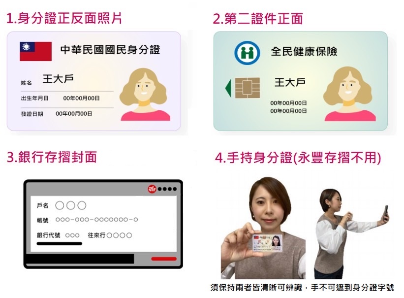 身分證、第二證件 (健保卡或駕照)、存摺、手持身分證照片 (用永豐存摺就不用)
