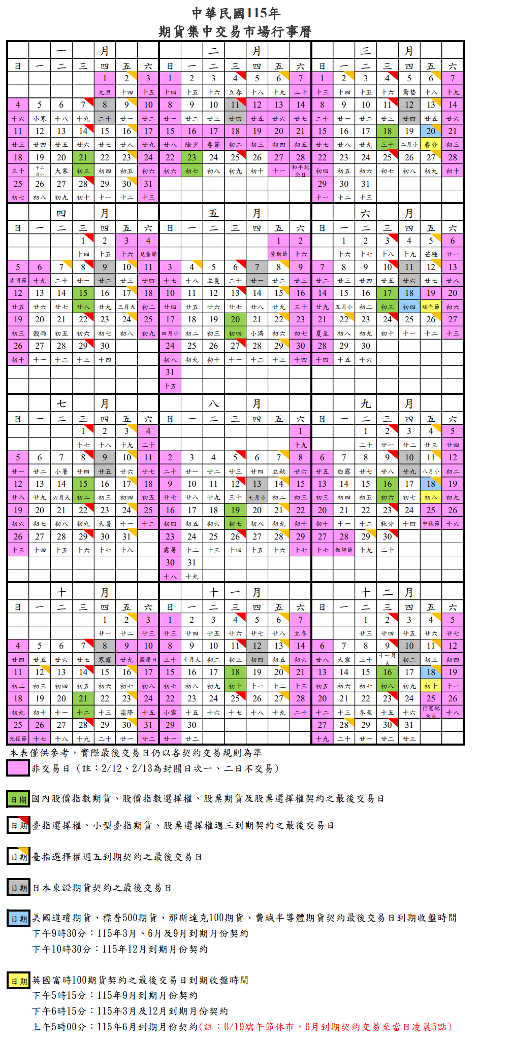| 中華民國115年(西元2026年)期貨市場開(休)市日期表 | |||