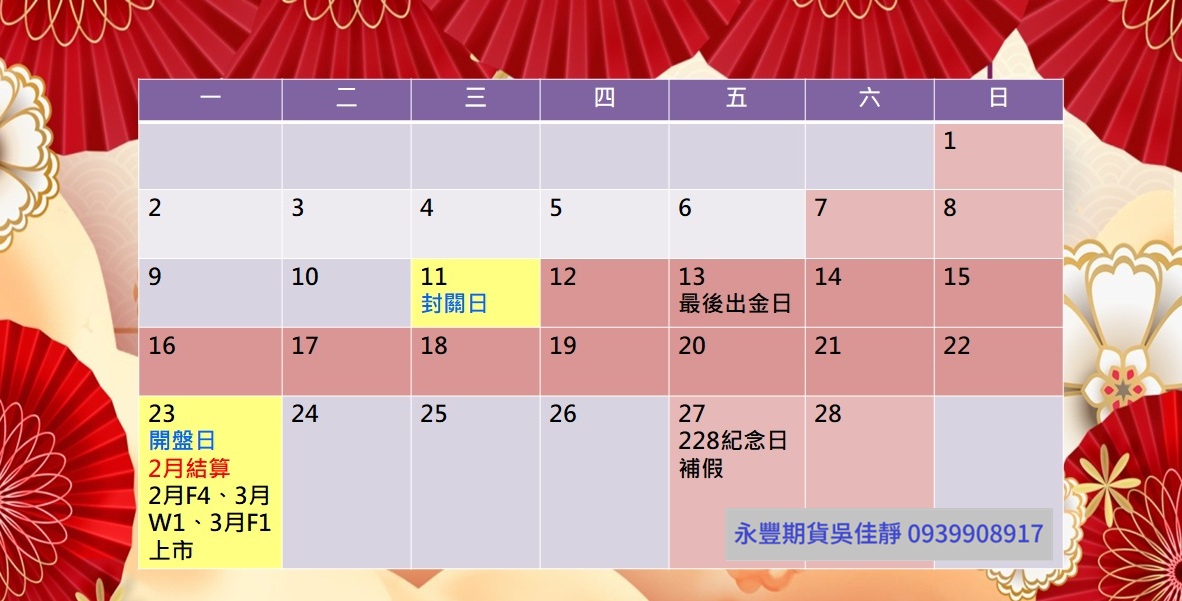 期貨封關日 2/11(三)、開盤日 2/23(一)